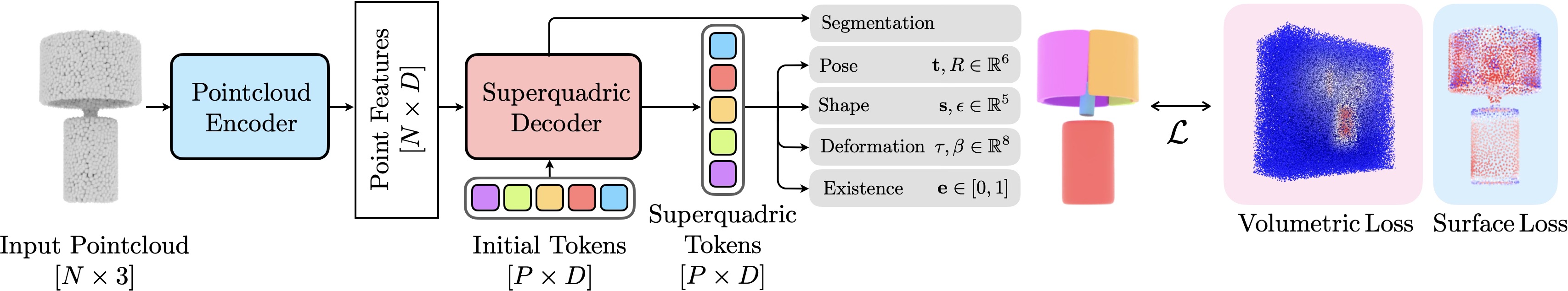 Overview of SuperFlex. Given an input point cloud, SuperFlex decomposes the object into a set of superquadric primitives, each defined by pose, shape, and deformation parameters. The model is trained via self-supervised joint volumetric and surface losses. A subsequent (optional) object-specific optimization can further improve the superquadric decomposition quality leveraging the same losses.