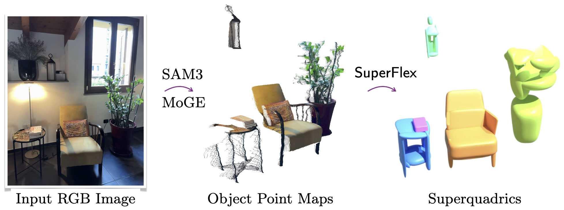 Inspired by how SAM3D proposed to reconstruct multi-object scenes from a single RGB frame, we experiment how SuperFlex can be used in the same monocular setting. We propose a modular pipeline that integrates SAM3 for object segmentation and MoGE for lifting 2D masks into partial 3D point clouds. While single-view observations suffer from inherent self-occlusion, our robust model, fine-tuned with occlusion augmentations, can still infer complete object geometries as sets of coherent deformable primitives.
